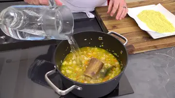 Añade el hueso de jamón, la hoja de laurel y la cúrcuma. Cubre todo con el agua y cuece las hortalizas a fuego medio durante 10 minutos.